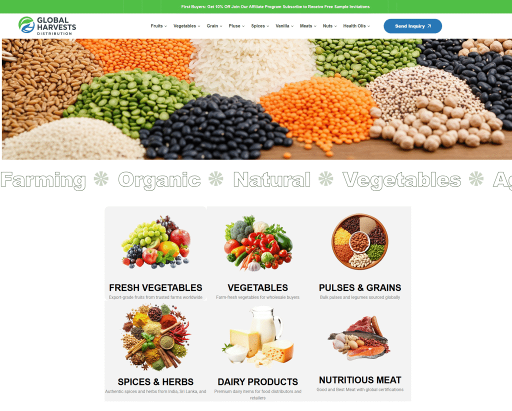Global Harvest is a trusted supplier and exporter of high-quality agricultural products, offering a diverse range of fresh vegetables, fruits, spices, dry fruits, and value-added food items. With a strong focus on quality, hygiene, and timely delivery, Global Harvest connects farmers to global markets, ensuring customers receive farm-fresh products at competitive prices. The company is committed to sustainable sourcing, customer satisfaction, and building long-term business relationships worldwide.